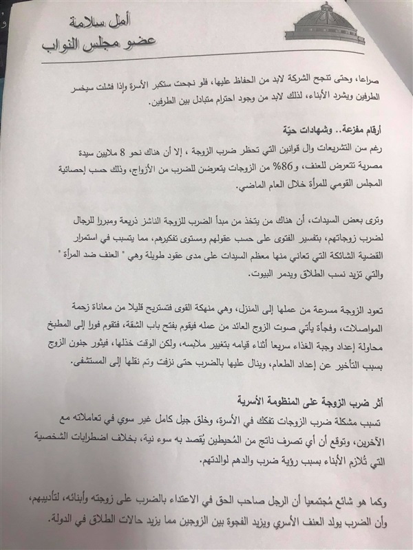 "اللي هيضرب مراته هيتحبس من 3لـ5سنين".. .. مشروع قانون من النائبة أمل سلامة في البرلمان