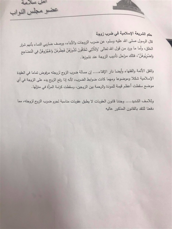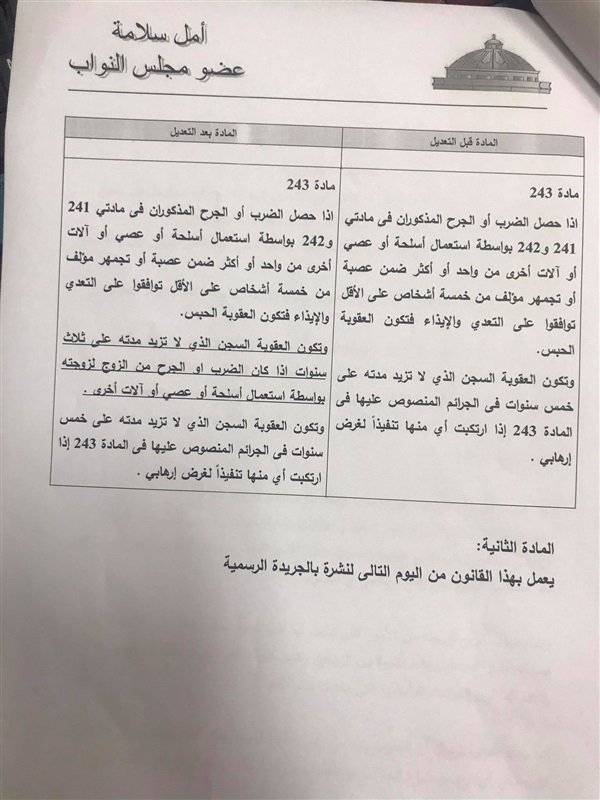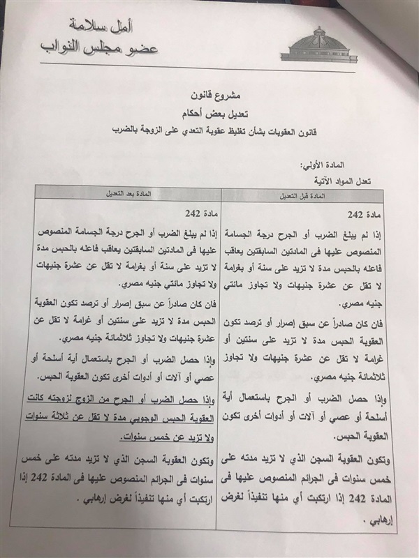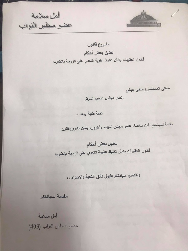 فى اعداد مشروع القانون ان قانون العقوبات لا يتضمن عقوبات مناسبة لجرم ضرب الزوج