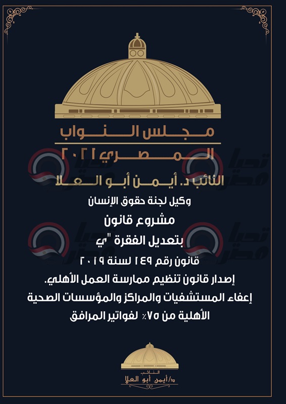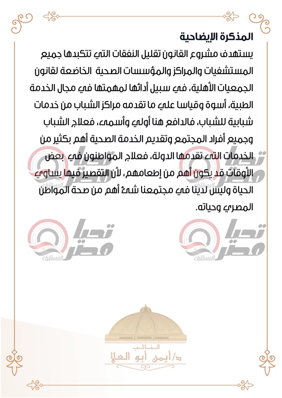منها مستشفي 57357 ومركز مجدي يعقوب..النائب أيمن أبو العلا يتقدم بمشروع قانون لإعفاء المستشفيات الأهلية من 75% من فواتير الكهرباء والمياه والغاز