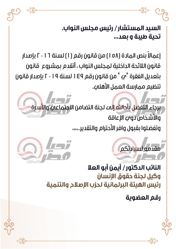 تقدم النائب أيمن أبو العلا، وكيل لجنة حقوق الإنسان، رئيس الهيئة
