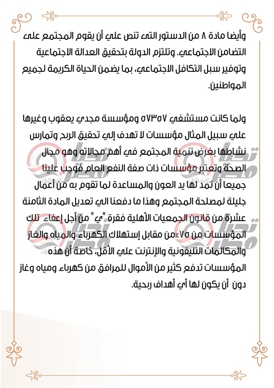 في السياق ذاته تضمنت المذكرة الإيضاحية: "أنه لما كانت مستشفى 57357 ومؤسسة مجدي يعقوب وغيرها على سبيل المثال مؤسسات لا تهدف إلى تحقيق الربح وتمارس نشاطها بغرض تنمية المجتمع في أهم مجالاته وهو مجال الصحة وتعتبر مؤسسات ذات صفة النفع العام فوجب علينا جميعا أن نمد لها يد العون والمساعدة لما تقوم به من أعمال جليلة لمصلحة المجتمع وهذا ما دفعنا إلى تعديل المادة الثامنة عشرة من قانون الجمعيات الأهلية بإضافة نص جديد لفقرة "ي" من أجل إعفاء تلك المؤسسات من 75%من مقابل استهلاك الكهرباء والمياه والغاز والمكالمات التليفونية والإنترنت على الأقل، خاصة أن هذه المؤسسات تدفع كثير من الأموال للمرافق من كهرباء ومياه وغاز دون أن يكون لها أي أهداف ربحية".