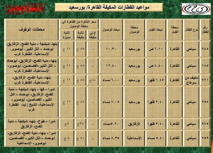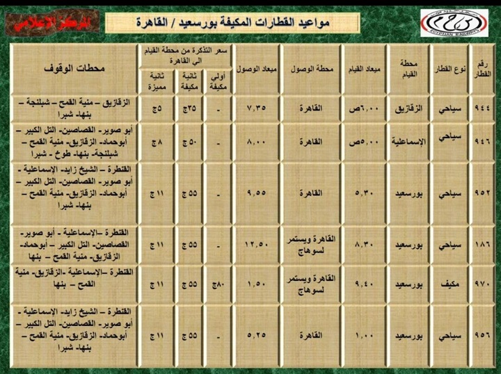 قطار رقم 965 القاهرة دمياط مختلط (مكيف - مميز) موعد قيامه الساعة 07.20 صباحا.
