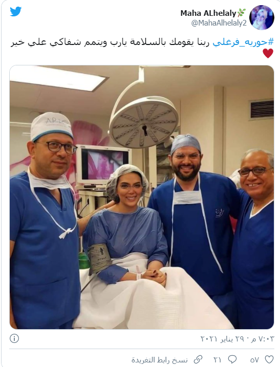 وتفاعل الكثير من مستخدمي "السوشيال ميديا" مع صورة حورية فرغلي من داخل غرفة العمليات، ودعوا لها بنجاح العملية، متمنين لها الشفاء العاجل وعودتهم إلى الحياه وعملها.