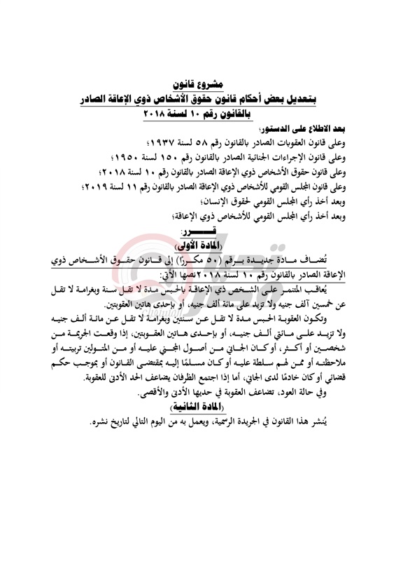 وتضمن مشروع القانون بأن تضاف مادة جديد برقم 50 مكررًا إلي قانون حقوق الأشخاص ذوي الإعاقة الصادر بالقانون