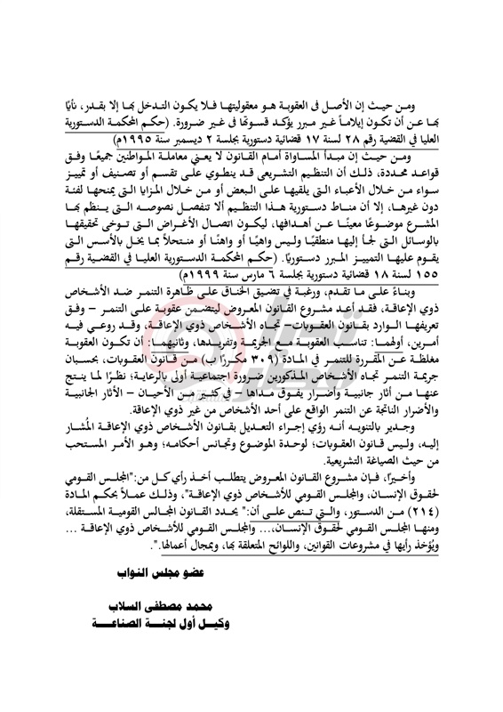 نص كامل ...النائب محمد السلاب يتقدم بمشروع قانون لتغليظ عقوبة التنمر علي الأشخاص ذوي الإعاقة.