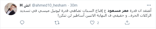 وعلق آخر على زواج معز مسعود من الفنانة حلا شيحة، قائلًا: "أعتقد ان قدرة معز مسعود على إقناع الستات تضاهي قدرة ليونيل ميسي في تسديد الركلات الحرة.. و حقيقي ف النهاية الاتنين أساطير لن تتكرر!".