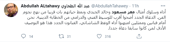 وغرد آخر، قائلًا: "أداء وسلوك أمثال معز مسعود وخالد الجندي ونمط حياتهم بات قريبا من نهج نجوم الفن.. الدعاة الجدد أضحوا أقرب للوسيط الفني والدرامي من الخطابة الدينية .. نحن أمام فنانين وممثلين امتهنوا أداء الوعظ الشاشاتي.. الفنانون الجدد هذا هو التوصيف الأدق لمن كانوا سابقا دعاة جددا".