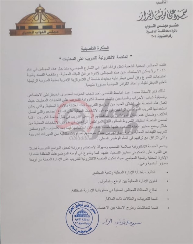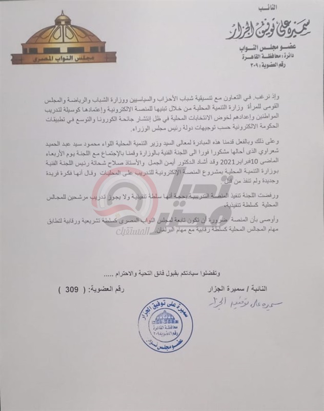 تقدمت النائبة سميرة الجزار، عضو لجنة الخطة والموازنة بمجلس النواب، بطلب إقتراح برغبة إلى المستشار حنفي جبالي رئيس البرلمان ، موجه إلى رئيس الوزراء الدكتور مصطفى مدبولي، بشأن إنشاء منصة إلكترونية للتدريب على انتخابات المحليات للشباب والمرأه برعاية وإدارة مجلس النواب المصري.