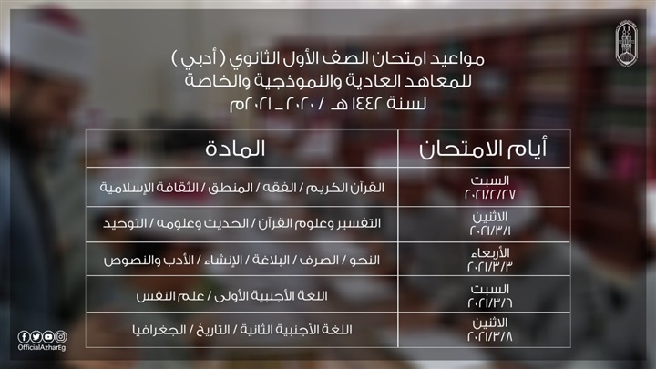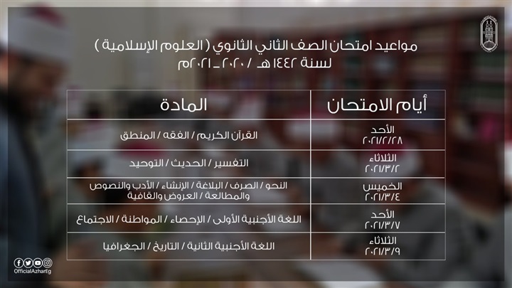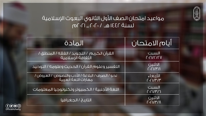الأحد 7 مارس 2021م في: اللغة الأجنبية/ الكمبيوتر وتكنولوجيا المعلومات، الثلاثاء 9 مارس 2021م في: التاريخ/ الجغرافيا.
