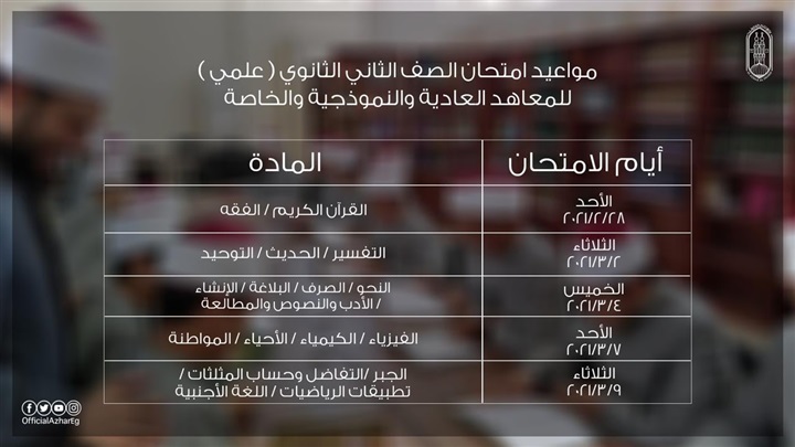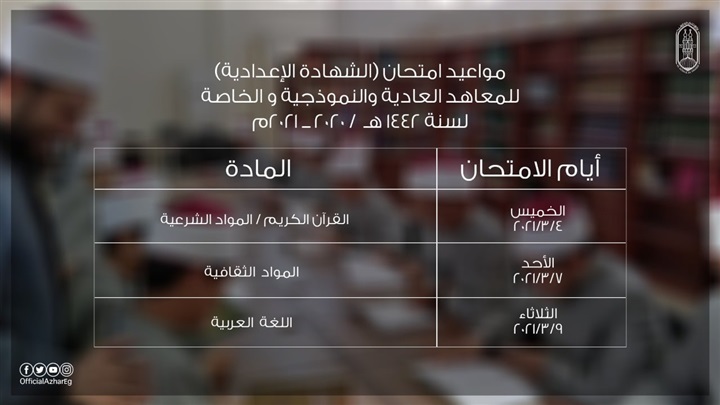 ويؤدي طلاب المرحلة الإعدادية بالمعاهد العادية والنموذجية والخاصة والبعوث الإسلامية امتحاناتهم كالتالي: الصف الأول الإعدادي: الثلاثاء 2 مارس 2021م في: القرآن الكريم والمواد الشرعية والعربية، الخميس 4 مارس 2021م في: المواد الثقافية. الصف الثاني الإعدادي: الأربعاء 3 مارس 2021م في: القرآن الكريم والمواد الشرعية والعربية، السبت 6 مارس 2021م في: المواد الثقافية. طلاب الشهادة الإعدادية: الخميس 4 مارس 2021م في: القرآن الكريم والمواد الشرعية، الأحد 7 مارس 2021م في: المواد الثقافية، الثلاثاء 9 مارس 2021م في: اللغة العربية.
