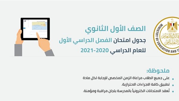 يذكر أن وزارة التربية والتعليم أعلنت سابقًا، أن تُعقد امتحانات الفصل الدراسي الأول للصفين الأول والثاني الثانوي بشكل الكتروني بالمدرسة للفئات التى تقرر تسليمها لجهاز التابلت، بجانب امتحانات ورقية لباقي الفئات بلجان مراقبة ومؤمنة، وملتزمة بكافة الاجراءات الاحترازية لحماية الطلاب من الإصابة بفيروس كورونا.