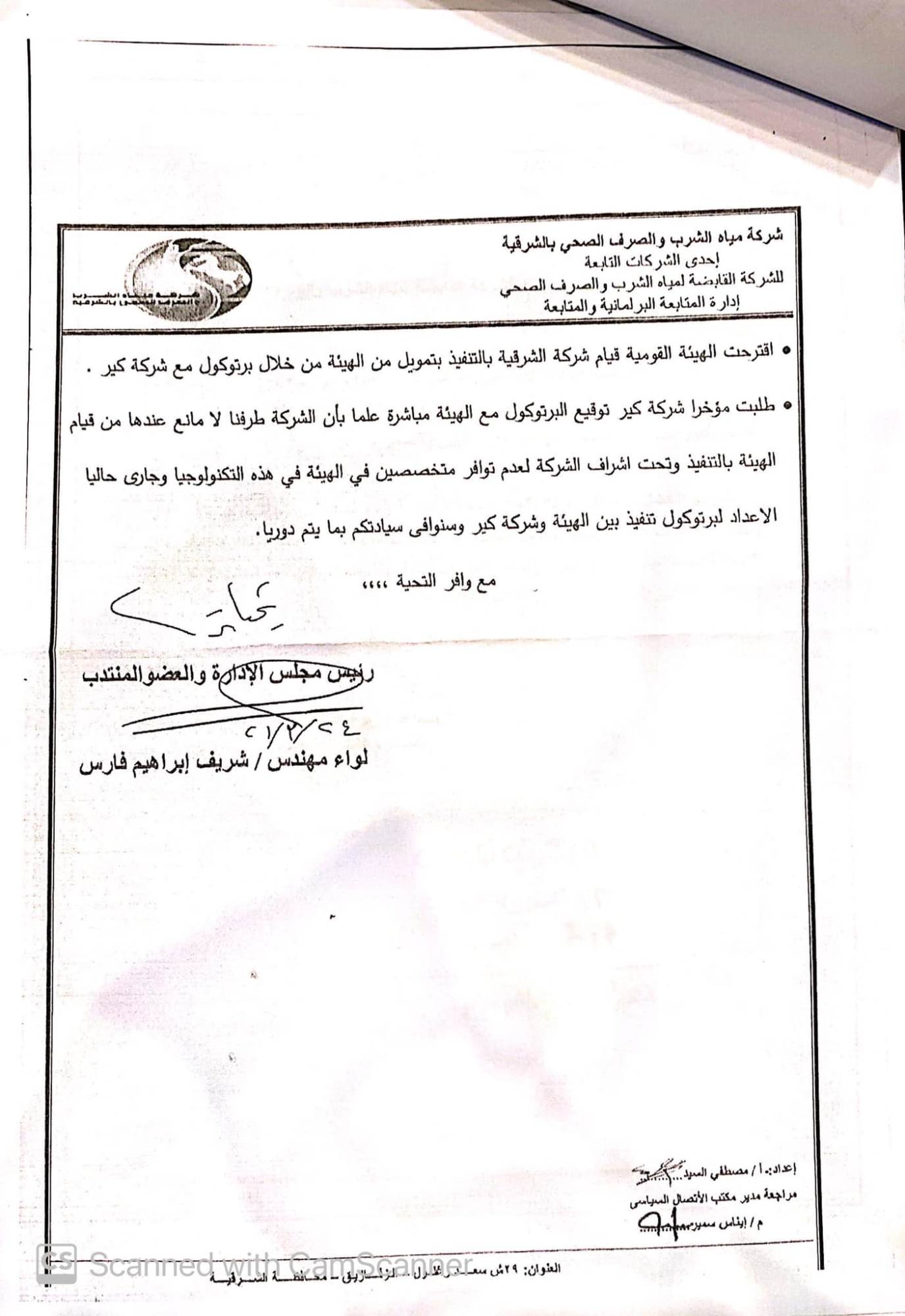 الموافقة على زيادة وتوسعة المحطة من ٤٠٠٠ م مكعب / يوم إلى ١٣٠٠٠ م مكعب / يوم. الموافقة على إستخدام تقنية MBR الجديدة والتي تكفل استيعاب لعام ٢٠٣٧ م . الموافقة على توقيع بروتوكول مع الشركة المنفذة (شركة كير) للاشراف على تنفيذ المشروع من ميزانية الهيئة فور إستكمال الدراسات الفنية وبروتوكول التنفيذ مع شركة ميله الشرب والصرف الصحي بالشرقية. الموافقة على تحويل مشروع صرف صحي كفر أبو الديب على محطة الحلوات لبدء العمل بها.