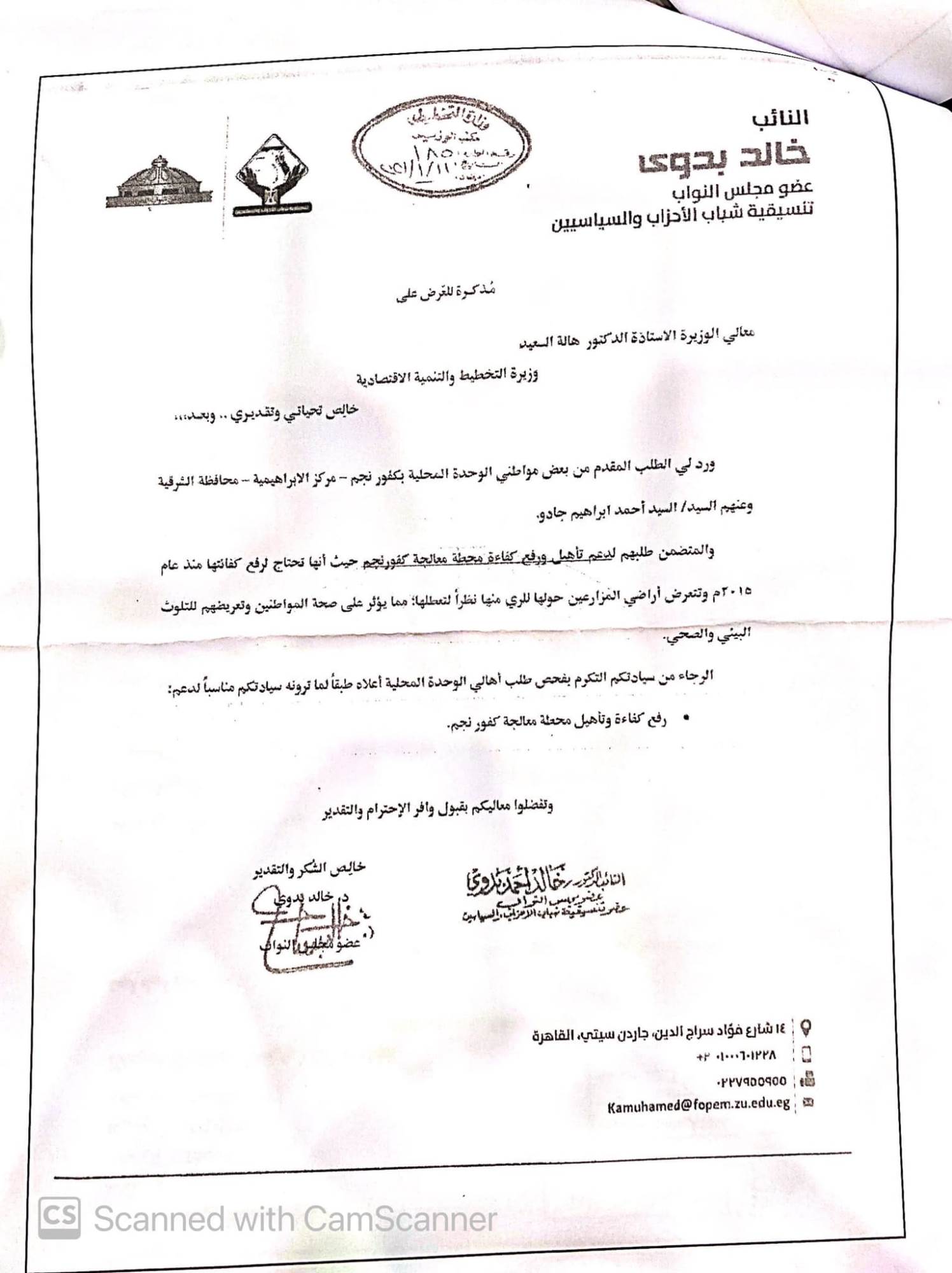 حصل النائب خالد بدوى، عضو مجلس النواب، عن تنسيقية شباب الأحزاب والسياسيين، على الموافقة بشأن توسعة ورفع كفاءة محطة معالجة كفور نجم لمياه الصرف الصحي، طبقاً لردود وزارة الاسكان والشركة القابضة لمياه الشرب والصرف الصحي وبالتوافق مع الهيئة القومية لمياه الشرب والصرف الصحي؛ وتم الموافقة على الآتي:-
