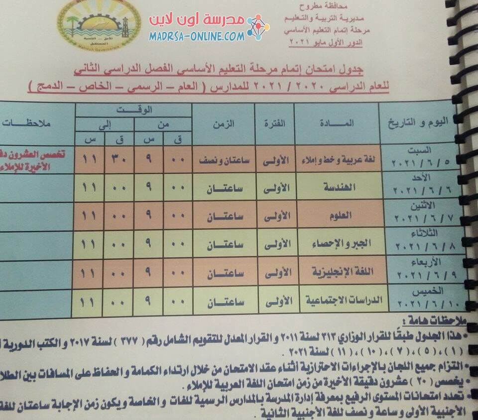 فيما اعتمد الدكتور صبري خالد وكيل وزارة التربية والتعليم بمحافظة قنا، جدول امتحانات الصف الثالث الإعدادي الترم الثاني 2021 محافظة قنا لشهادة إتمام الدراسة بمرحلة التعليم الأساسي الشهادة الإعدادية في محافظة قنا 2021، حيث ستبدأ في الأول من يونيو المقبل. وأول يوم جدول امتحانات الصف الثالث الإعدادي الترم الثاني 2021 محافظة قنا، يوافق يوم الثلاثاء 1 يونيو 2021، وأول المواد اللغة العربية بكل أقسامها ويبدأ من الساعة 8 حتى الساعة 10.30 صباحا، والأربعاء وهو اليوم التالي للامتحانات، مادة الجبر والإحصاء لمدة ساعتين، والخميس هو اليوم الثالث.