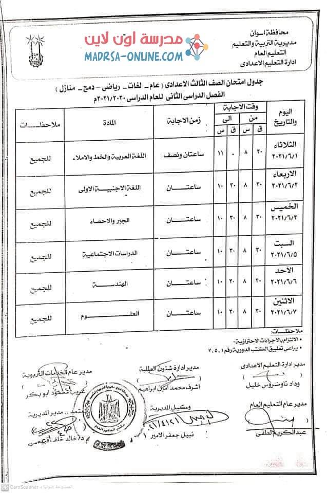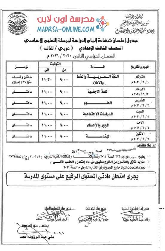 جدول امتحانات الصف الثالث الإعدادي الترم الثاني 2021 محافظة قنا