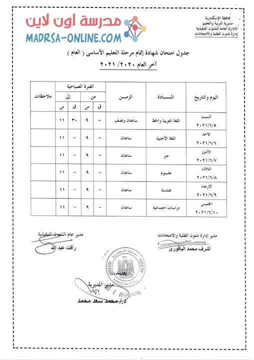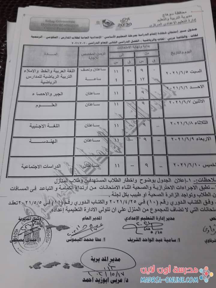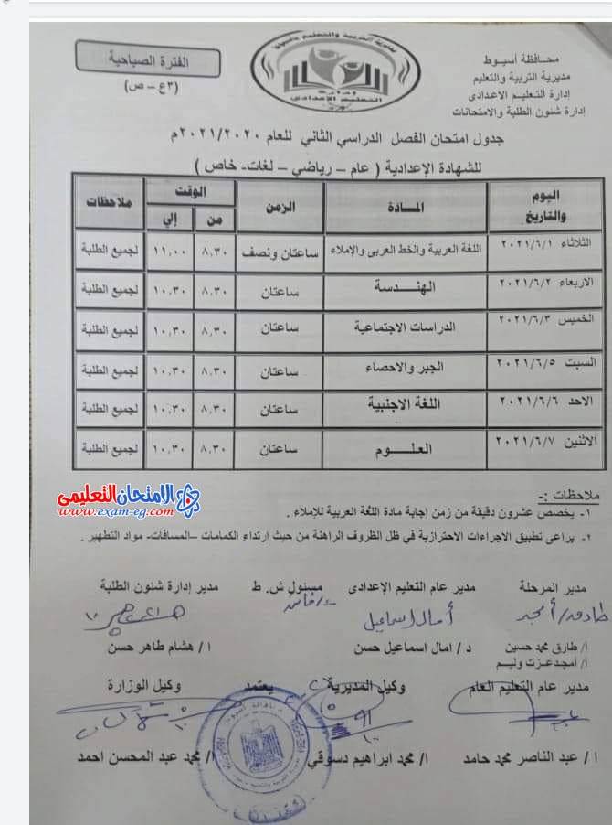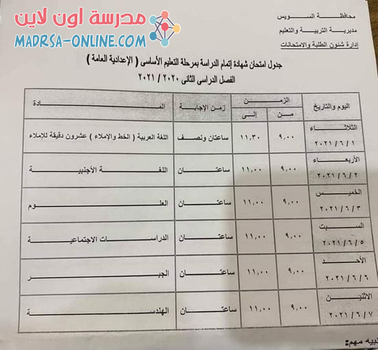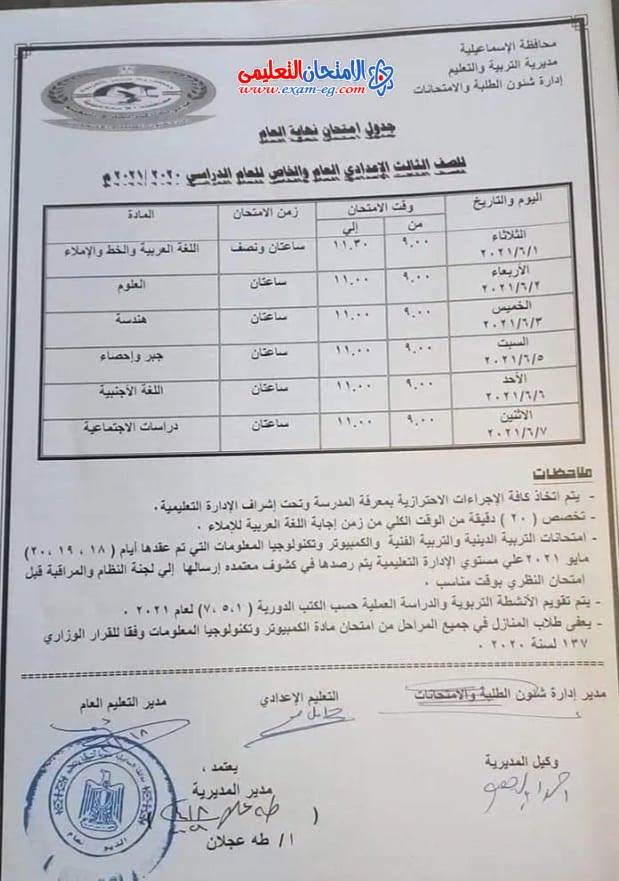 جدول امتحانات الصف الثالث الإعدادي الترم الثاني 2021