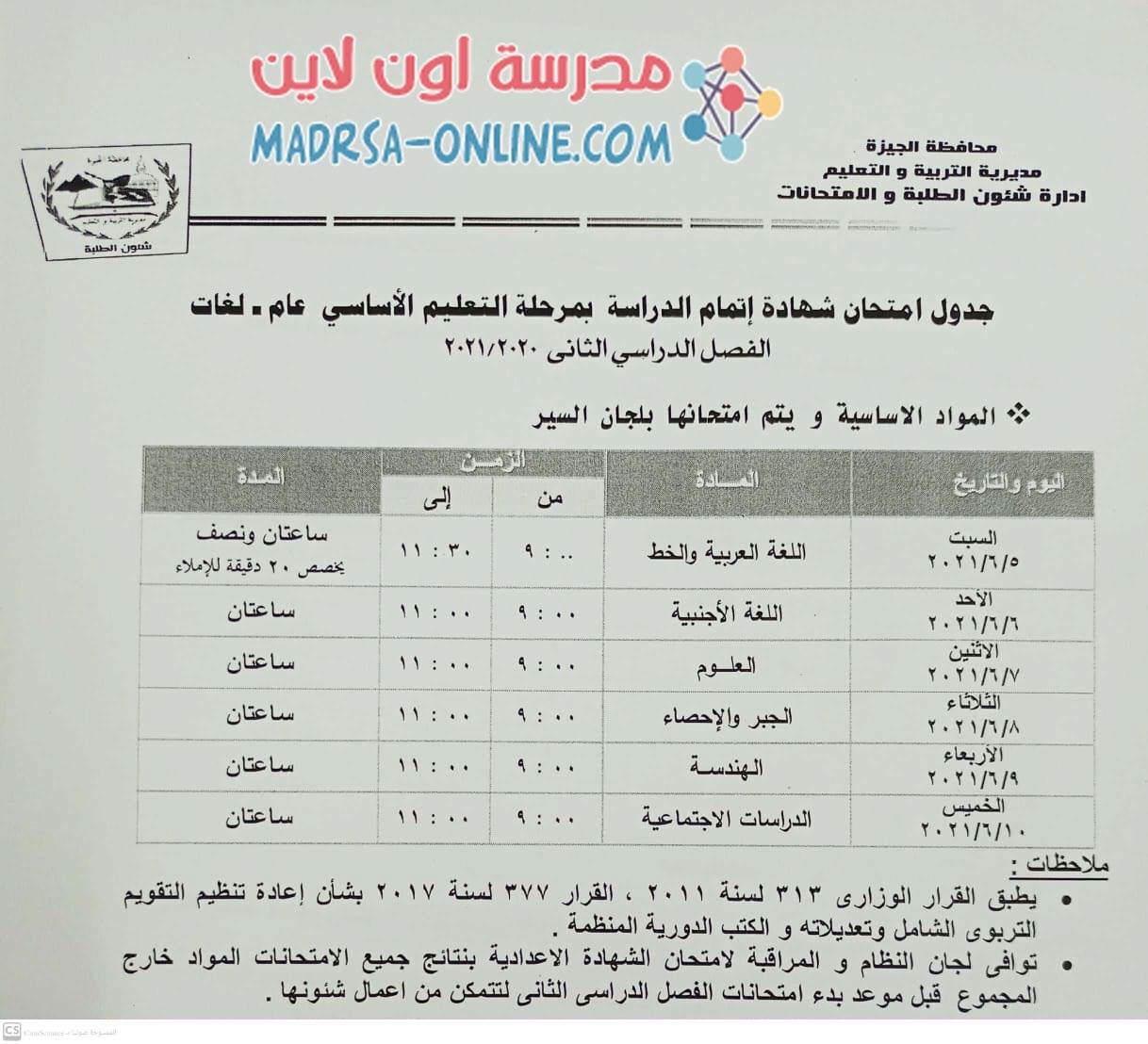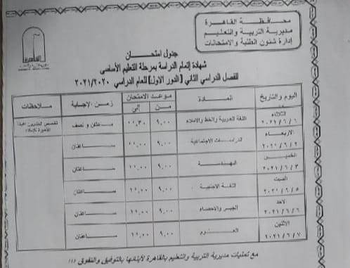 اعتمد اللواء خالد عبد العال، محافظ القاهرة جدول امتحان شهادة إتمام الدراسة بمرحلة التعليم الأساسى (الصف الثالث الاعدادى) للفصل الدراسى الثانى للعام الدراسى 2020/2021، وتجرى الامتحانات خلال الفترة من 1 يونيو إلى 7 يونيو 2021. وأشار محمد عطية مدير مديرية التربية والتعليم بالقاهرة إلى أن الطلبة والطالبات سيؤدون امتحان مادة اللغة العربية والخط والإملاء يوم الثلاثاء 1 يونيو، ومادة الدراسات الاجتماعية يوم الأربعاء 2 يوينو، ومادة الهندسة يوم الخميس 3 يوينو، ومادة اللغة الأجنبية يوم السبت 5 يونيو ومادة الجبر والإحصاء يوم الأحد 6 يونيو وتختتم الامتحانات يوم الإثنين 7 يونيو بمادة العلوم.