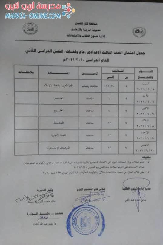 جدول امتحانات الصف الثالث الاعدادي الترم الثاني 2021 محافظة الغربية