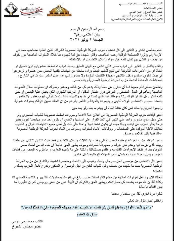 أكدالنائب محمد عزمي عضو مجلس الشيوخ في بيانه الثاني أنه يتقدم بخالص الشكر والتقدير إلي كل أعضاء حزب الحركة الوطنية المصرية الشرفاء الذين أعلنوا تضامنهم في الأزمة ولم يؤثروا المصلحة الوقتية وحب المناصب، وقالوا شهادة حق لما شهدوه خلال السنوات الماضية دون خوف من إيقاف أو تنكيل بهم لقول كلمة حق سواء بإعلان التضامن أو بالاستقالة.