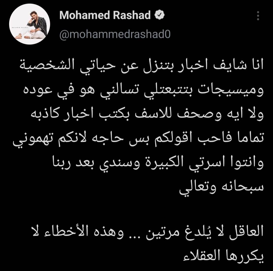 وغرد عبر حسابه الرسمي على موقع التدوينات القصيرة «تويتر»، بتويتة كتب فيها: "أنا شايف أخبار بتنزل عن حياتي الشخصية ومسدجات بتتبعتلي تسالني هو في عودة ولا ايه.. وصحف للاسف بكتب اخبار كاذبه تمامًا.. فاحب اقولكم بس حاجه لأنكم تهموني وأنتوا أسرتي الكبيرة وسندي بعد ربنا سبحانه وتعالي.. العاقل لا يُلدغ مرتين.. وهذه الأخطاء لا يكررها العقلاء".