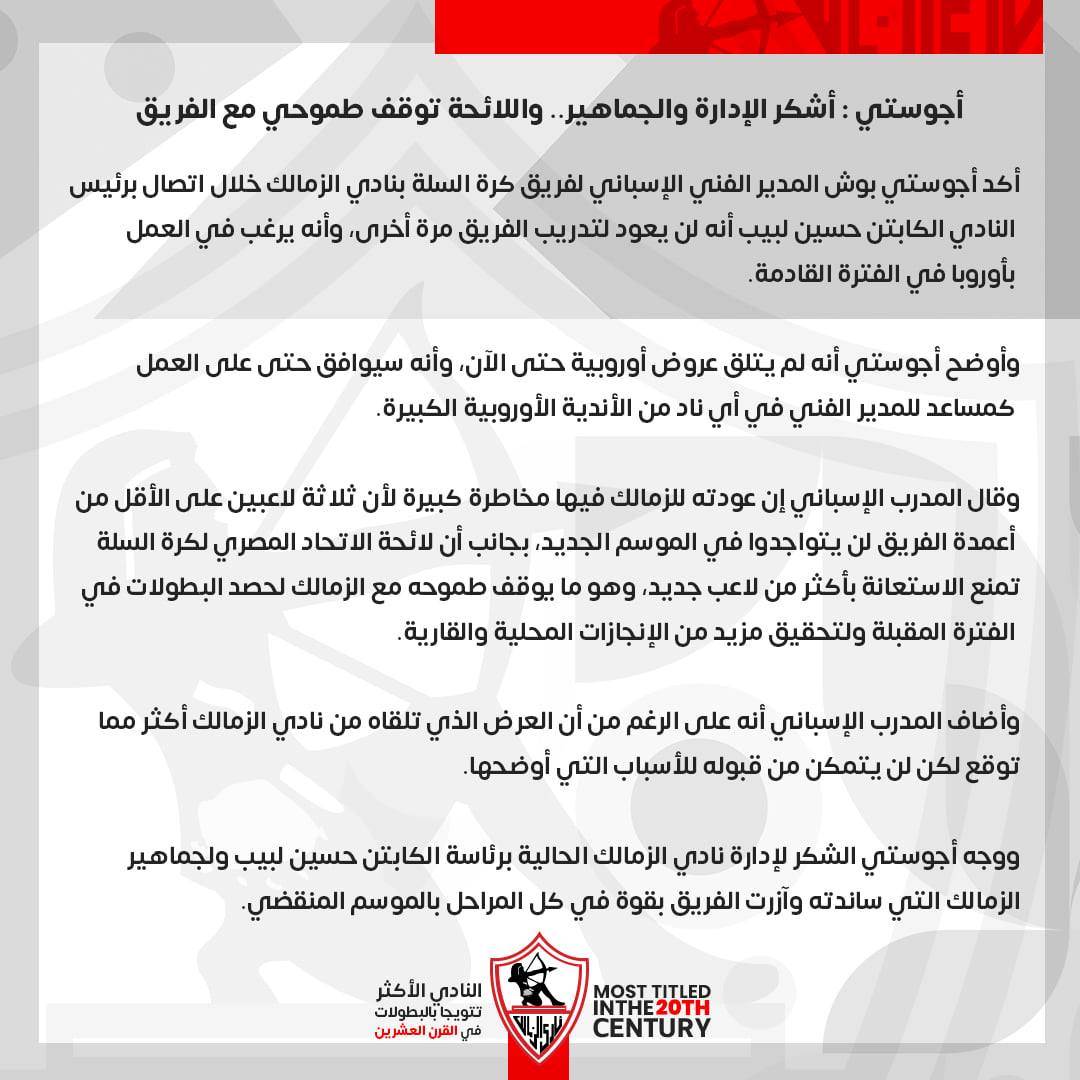 كتب أوجستي عبر حسابه الشخصي على موقع تويتر: "في هذا اليوم أعلن قراري بعدم تمديد تعاقدي مع الزمالك".