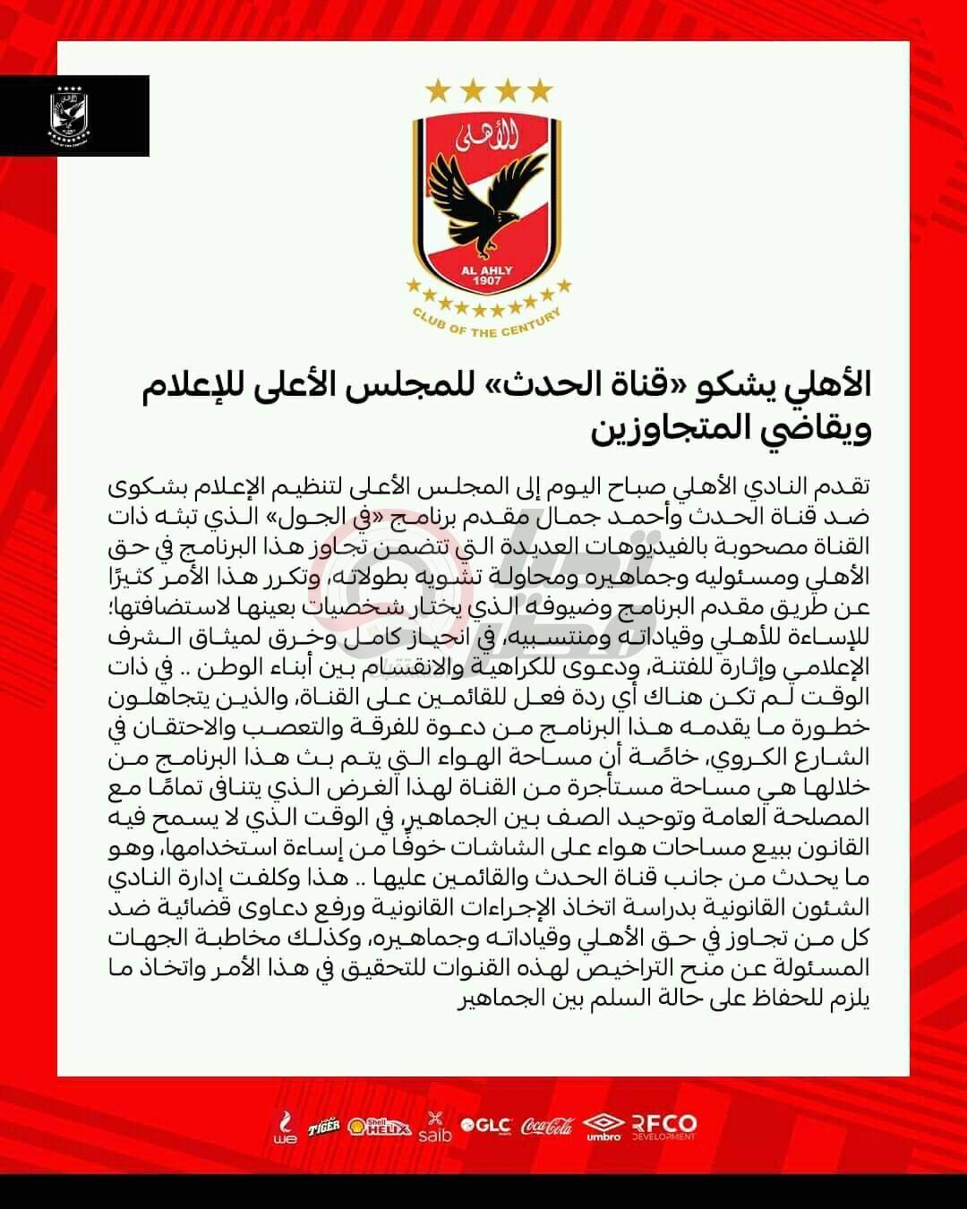 “تقدم النادي الأهلي صباح اليوم إلى المجلس الأعلى لتنظيم الإعلام بشكاوى ضد قناة الحدث وأحمد جمال مقدم برنامج «في الجول» الذي تبثه ذات القناة مصحوبة بالفيديوهات العديدة التي تتضمن تجاوز هذا البرنامج في حق الأهلي ومسئوليه وجماهيره، ومحاولة تشويه بطولاته، وتكرر هذا الأمر كثيرًا عن طريق مقدم البرنامج وضيوفه الذي يختار شخصيات بعينها لاستضافتها؛ للإساءة للأهلي وقياداته ومنتسبيه، في انحياز كامل وخرق لميثاق الشرف الإعلامي وإثارة للفتنة، ودعوى للكراهية والانقسام بين أبناء الوطن”.