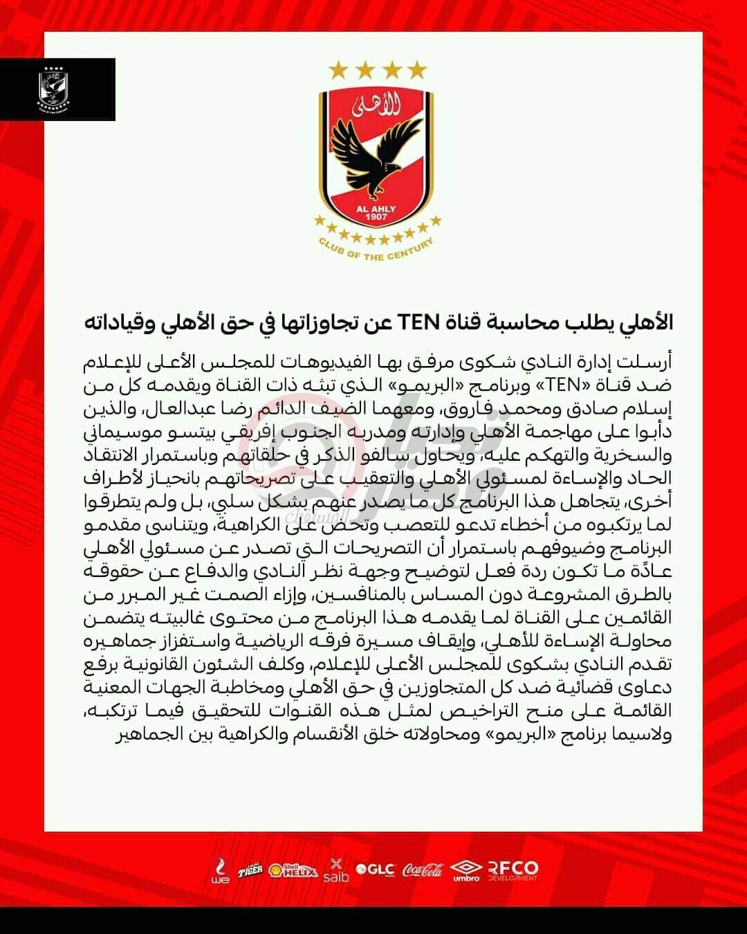 وتابع الأهلي : “وفي ذات السياق تقدم النادي أيضًا بشكاوى مماثلة مرفق بها الفيديوهات للمجلس الأعلى للإعلام ضد قناة «TEN» وبرنامج «البريمو» الذي تبثه ذات القناة ويقدمه كلٌ من إسلام صادق ومحمد فاروق، ومعهما الضيف الدائم رضا عبدالعال، والذين دأبوا على مهاجمة الأهلي وإدارته ومدربه الجنوب إفريقي بيتسو موسيماني والسخرية والتهكم عليه، ويحاول سالفو الذكر في حلقاتهم ــ وبتستمرار ــ الانتقاد الحاد والإساءة لمسئولي الأهلي والتعقيب على تصريحاتهم بانحياز لأطراف أخرى، ويتجاهل هذا البرنامج كل ما يصدرعنهم بشكل سلبي، بل ولم يتطرقوا لما يرتكبوه من أخطاء تدعو للتعصب، وتحض على الكراهية، ويتناسى مقدمو البرنامج وضيوفهم ــ باستمرار ــ أن التصريحات التي تصدر عن مسئولي الأهلي عادًة ما تكون ردة فعل لتوضيح وجهة نظر النادي والدفاع عن حقوقه بالطرق المشروعة دون المساس بالمنافسين، وإزاء الصمت غير المبرر من القائمين على القناة لما يقدمه هذا البرنامج من محتوى غالبيته يتضمن محاولة الإساءة للأهلي وإيقاف مسيرة فرقه الرياضية واستفزاز جماهيره”.