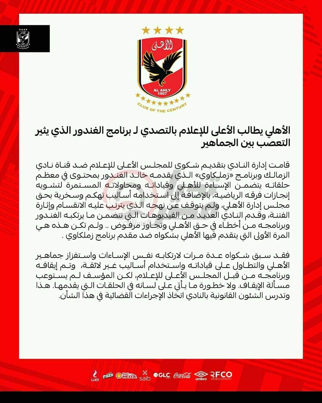 وأختتم: “لم تكن هذه هي المرة الأولى التي يتقدم فيها الأهلي بشكواه ضد مقدم برنامج زملكاوي. فقد سبق شكواه عدة مرات لارتكابه نفس الإساءات، واستفزاز جماهير الأهلي والتطاول على قياداته، واستخدام أساليب غير لائقة، وتم إيقافه وبرنامجه من قبل المجلس الأعلى للإعلام، لكن المؤسف لم يستوعب مسألة الإيقاف، ولا خطورة ما يأتي على لسانه في الحلقات التي يقدمها، هذا وتدرس الشئون القانونية بالنادي اتخاذ الإجراءات القضائية في هذا الشأن.
