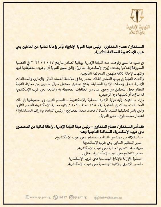 أمر المستشار عصام المنشاوي رئيس هيئة النيابة الإدارية، بإحالة ثمانية من المختصين بحي غرب الإسكندرية، للمحاكمة التأديبية فى القضية المعروفة إعلامياً بحادث (برج الإسكندرية المائل)، وهم: - عدد ثلاثة من مهندسي التنظيم السابقين بحي غرب الإسكندرية. - مدير التنظيم السابق بحي غرب الإسكندرية - مهندسة التنظيم الحالية بحي غرب الإسكندرية. - مدير التنظيم بحي غرب الإسكندرية الحالي. - مسئول الإزالة بالإدارة الهندسية بحي غرب الإسكندرية - المدير الإداري بالإدارة الهندسية بحي غرب الإسكندرية.