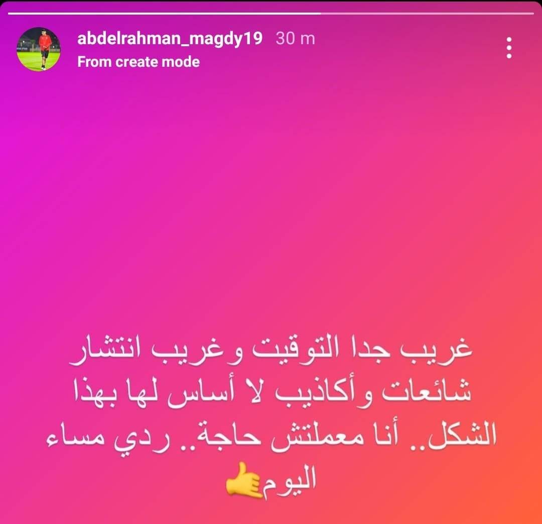وكتب عبدالرحمن مجدي عبر الإنستغرام : “ غريب جدا التوقيت، ونشر الأكاذيب في ذلك الوقت ، أنا معملتش حاجة ، ردي سيكون مساء اليوم”.