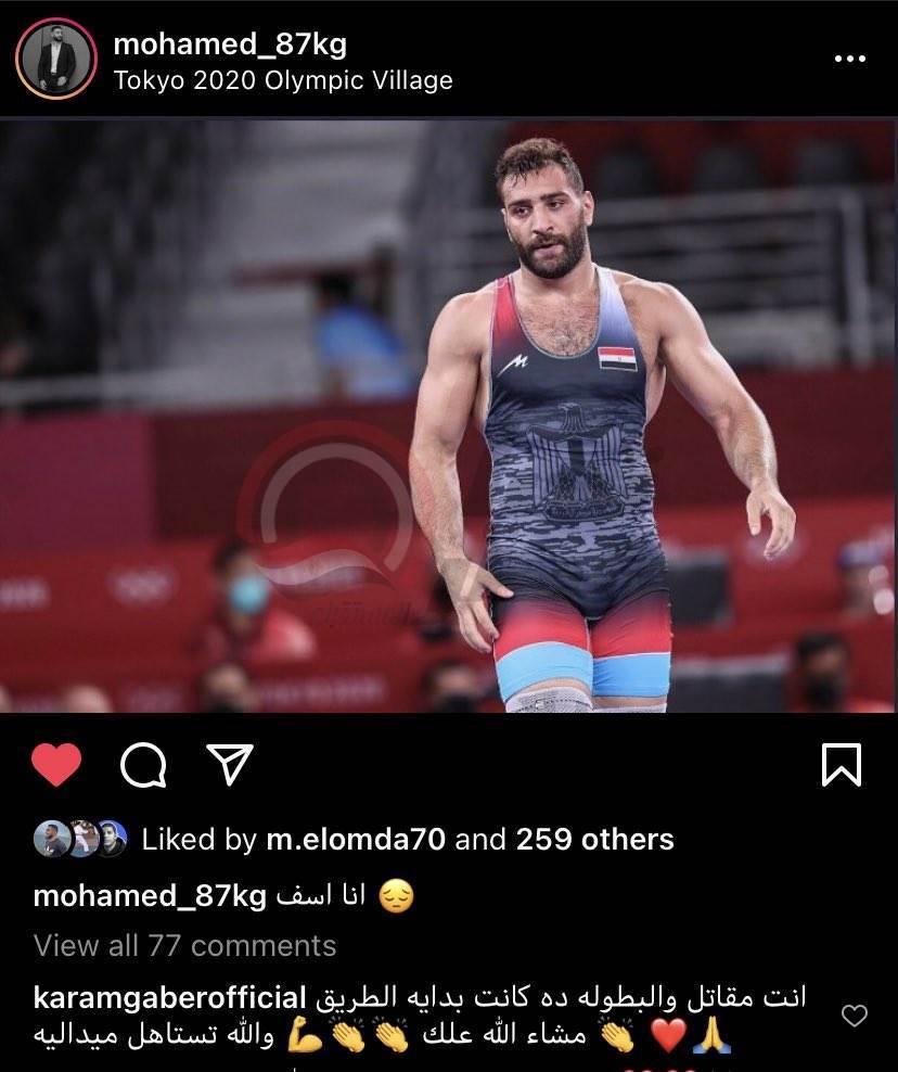 وكتب محمد متولي عبر انستجرام: "انا اسف" ، في إشارة لحزنه على الخسارة ، ليرد عليه كرم جابر قائلا: "انت مقاتل، ودي كانت البداية ليك، ماشاء الله عليك تستاهل ميدالية".