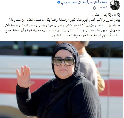 كما قدم الفنان محمد صبحي التعازي لأسرة الفنانة دلال عبد العزيز من خلال منشور له عبر حسابه الرسمي بموقع ‘‘فيس بوك‘‘ معلقََا: إنّا لله وإنّا إليهِ رَاجعُون ببالغ الحزن والأسى أنعي اليوم فنانة كبيرة وإنسانة رائعة بكل ما تحمل الكلمة من معني دلال عبدالعزيز.. خالص عزائي لدنيا سمير غانم ورامي رضوان وإيمي وحسن الرداد والوسط الفني كله وكل جمهورها الحبيب.. وداعًا يا دلال.. ادعو الله لكِ بالرحمة والمغفرة وأن يسكنك فسيح جناته وأن يلهم أسرتك وأهلك ومحبينك الصبر والسلوان”.