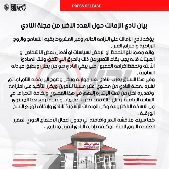 وكانت المجلة الرسمية لنادي الزمالك أثارت الجدل خلال الساعات الماضية بعد نشرها عدد أثار غضب جماهير القلعة الحمراء، الأمر الذي جعل العديد من جماهير الأهلي تطالب بمحاكمة المسئوليين.