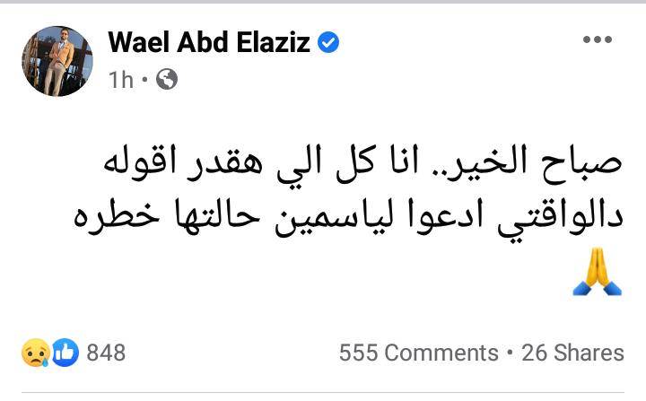 وكشف شقيقها الفنان وائل عبد العزيز عن آخر تطورات حالتها الصحية من خلال حسابه الرسمي على موقع التواصل الاجتماعي «فيسبوك»: "صباح الخير، أنا كل اللي هقدر اقوله دلوقتي.. ادعوا لياسمين حالتها خطرة"، مطالبًا متابعيه بالدعاء لها.