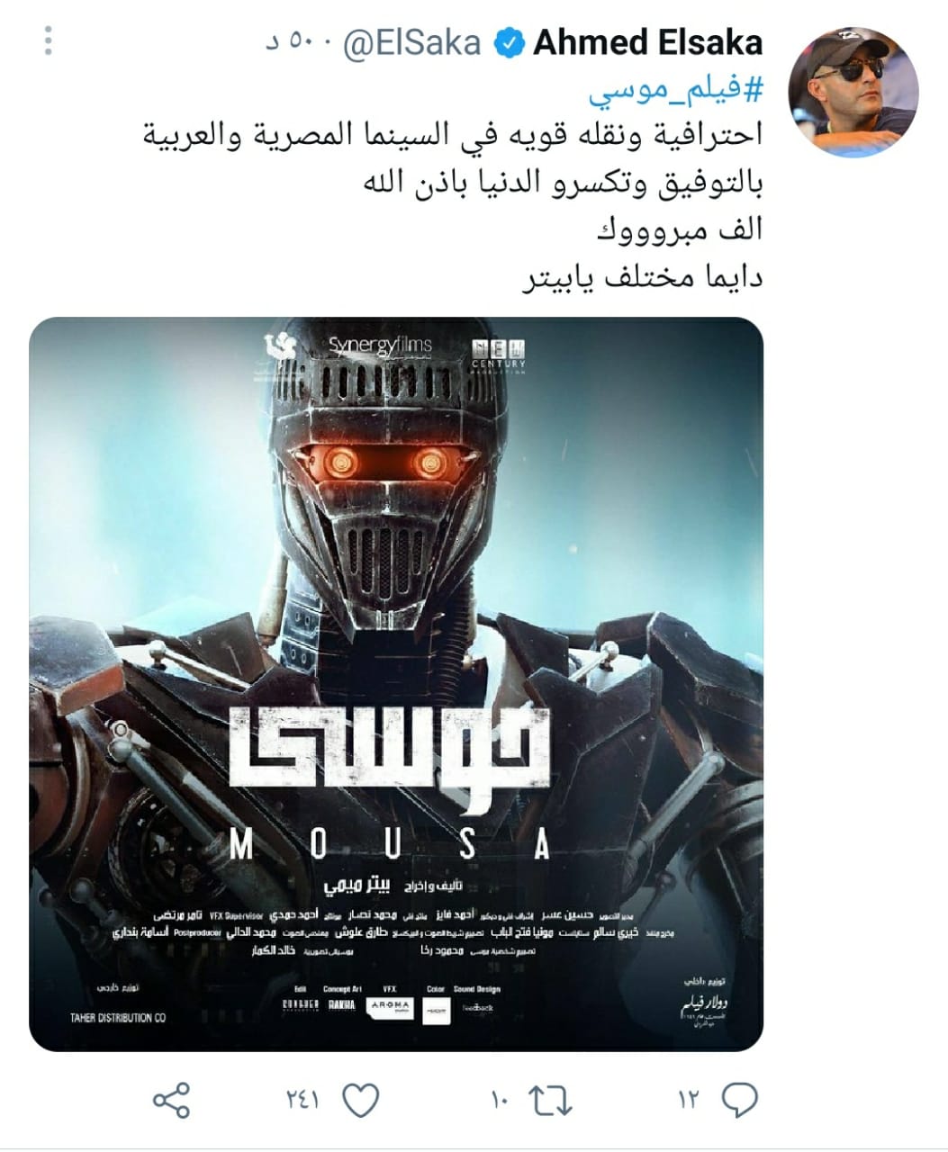 نشر أحمد السقا البوستر الرسمي لفيلم «موسى» عبر حسابه الشخصي بموقع التدوينات القصيرة “تويتر”، وعلق عليها مشيدا بالعمل: “فيلم موسى احترافية ونقلة قوية في السينما المصرية والعربية، بالتوفيق وتكسروا الدنيا بإذن الله، ألف مبروك دايمًا مختلف يا بيتر”.