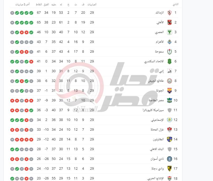 وأستمر الزمالك على صدارة ترتيب الدوري المصري بعد الفوز الإتحاد وتعادل الأهلي مع الإسماعيلي في الجولة التاسعة والعشرون من الدوري الممتاز وجاء ترتيب الدوري بالكامل كالتالي، ويستعرض تحيا مصر ترتيب الدوري المصري بعد تعادل الأهلي والإسماعيلي :