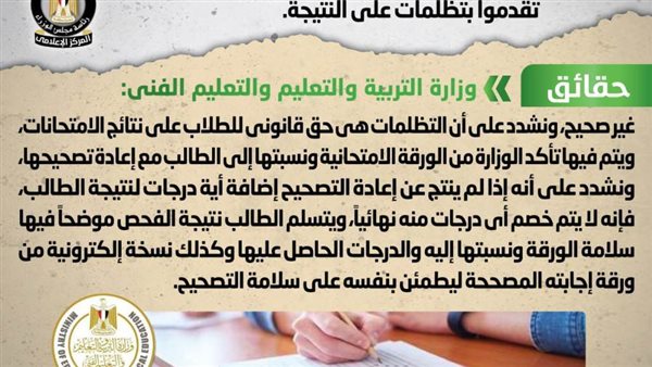وشدد على ان أن التظلمات هي حق قانوني للطلاب على نتائج الامتحانات، ويتم فيها تأكد الوزارة من الورقة الامتحانية ونسبتها إلى الطالب، مع إعادة تصحيحها، مُشددةً على أنه إذا لم ينتج عن إعادة التصحيح إضافة أية درجات لنتيجة الطالب، فإنه لا يتم خصم أي درجات منه نهائياً، ويتسلم الطالب نتيجة الفحص موضحاً فيها سلامة الورقة، ونسبتها إليه والدرجات الحاصل عليها، وكذلك نسخة إلكترونية من ورقة إجابته المصححة ليطمئن بنفسه على سلامة التصحيح.