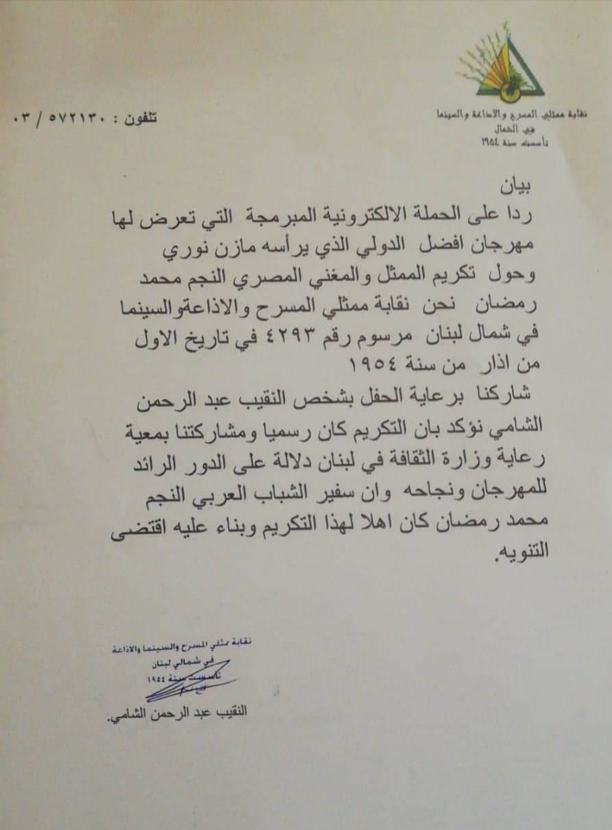 وتابع: “"شاركنا برعاية الحفل بشخص النقيب عبد الرحمن الشامي، نؤكد بأن التكريم كان رسميًا ومشاركتنا بمعية رعاية وزارة الثقافة في لبنان دلالة على الدور الرائد للمهرجان ونجاحه وأن سفير الشباب العربي النجم محمد رمضان، كان أهلًا لهذا التكريم وبناء عليه اقتضى التنويه".