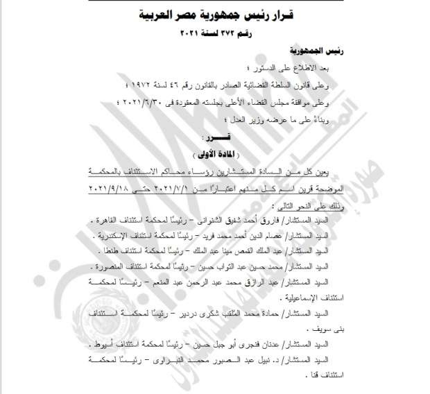 نشرت الجريدة الرسمية، اليوم الثلاثاء، قرارات الرئيس عبد الفتاح السيسي، بتعيين رؤساء محكمة الاستئناف.
