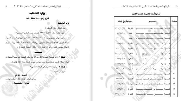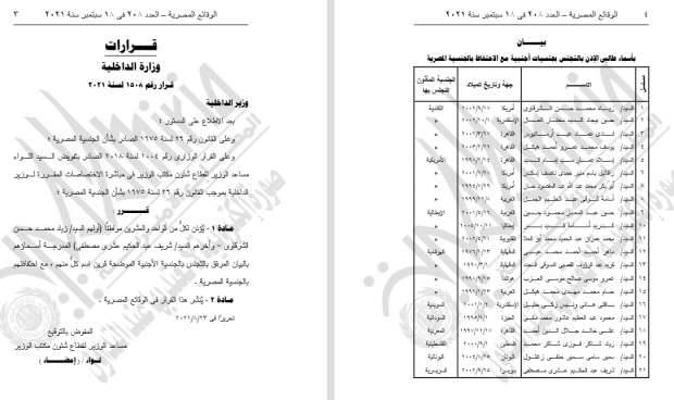 أصدر اللواء محمود توفيق وزير الداخلية، القرار رقم 1508 و1509 لسنة 2021 بالإذن لـ21 مواطنًا مصريًا، باكتساب جنسيات أجنبية إلى جانب المصرية، كما ردت الجنسية المصرية لـ14 شخصًا، أولهما زياد محمد سيد، سماح فؤاد ونشر القرار في الوقائع المصرية.