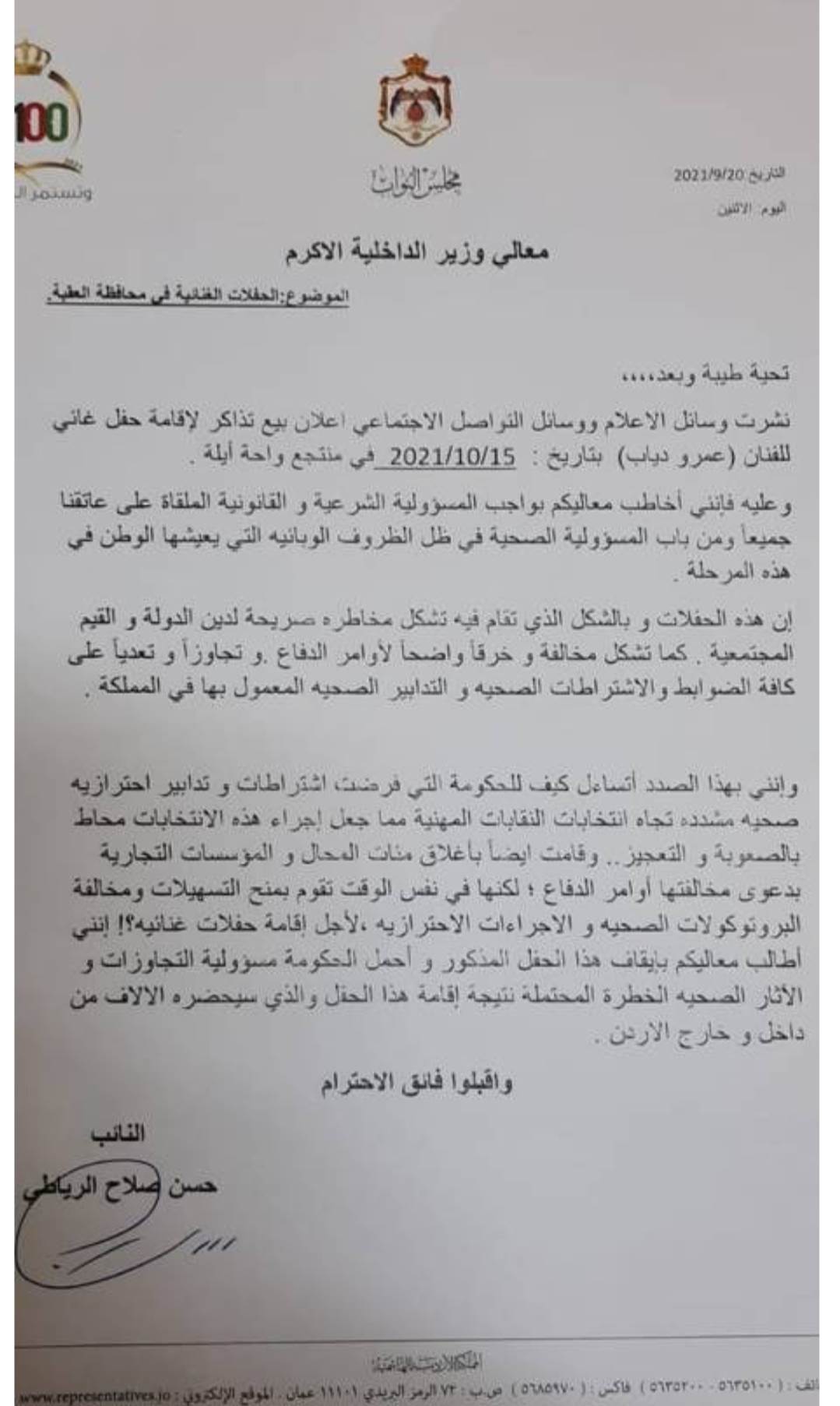 وقال إن طلبه جاء بناء على واجب المسؤولية الشرعية والقانونية الملقاة على عاتقنا جميعًا ومن باب المسؤولية الصحية في ظل الظروف الوبائية التي يعيشها الوطن في هذه المرحلة، مختتما حديثه محملًا الحكومة مسؤولية التجاوزات والآثار الصحية الخطيرة المحتملة نتيجة إقامة هذا الحفل والذي سيحضره الالاف من داخل و خارج الأردن.