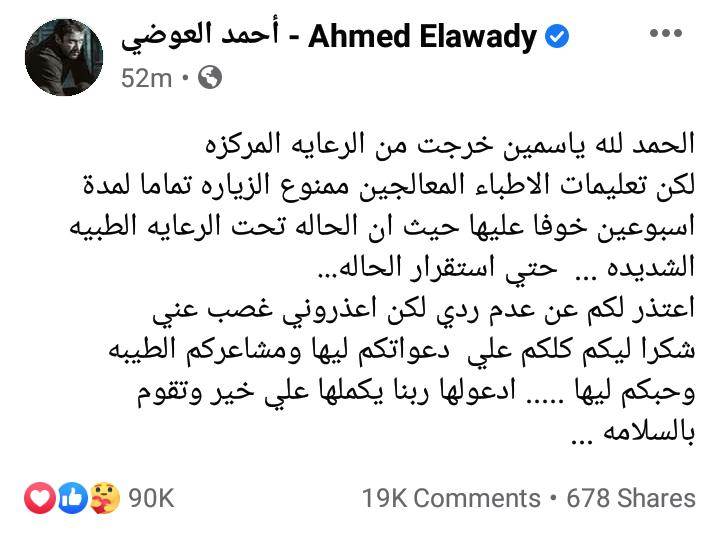طمأن العوضي الجمهور على حالة ياسمين عبد العزيز من خلال حسابه الشخصي بموقع التواصل الاجتماعي فيسبوك، مشيرا إلى خروجها من العناية ومنعها من أي زيارات فكتب: “الحمد لله ياسمين خرجت من الرعاية المركزة، لكن تعليمات الأطباء المعالجين ممنوع الزيارة تماما لمدة أسبوعين خوفا عليها، حيث أن الحالة تحت الرعاية الطبية الشديدة، حتى استقرار الحالة”.