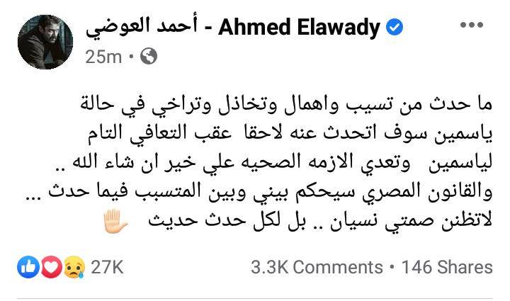 وبعد سفر ياسمين عبد العزيز لسويسرا وبين مؤمرات القيل والقال، صرح احمد العوضي برسالة غامضة للجمهور، فيي أول تعليق له عقب سفر الفنانة ياسمين عبد العزيز إلى سويسرا لاستكمال علاجها بمدينة جينف، فكتب عبر حسابه الشخصي بموقع التواصل الإجتماعي “فيسبوك” متوعدا للمتسبب في أزمة زوجته الفنانة ياسمين عبد العزيز، فقال: “ما حدث من تسيب واهمال وتخاذل وتراخي في حالة ياسمين سوف اتحدث عنه لاحقا عقب التعافي التام لياسمين وتعدي الازمه الصحيه علي خير ان شاء الله .. والقانون المصري سيحكم بيني وبين المتسبب فيما حدث”.