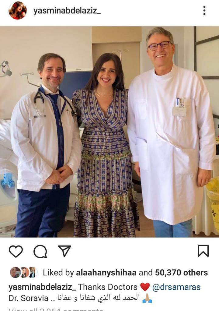 شاركت الفنانة ياسمين عبد العزيز في أول ظهور لها بعد إعلانها تعافيها بشكل كامل من المرض الذي أصابها لعدة أشهر وأدى إلى اختفائها عن الساحة الفنية لفترة طويلة، اذ نشرت عبد العزيز صورة لها برفقة أطبائها المعالجين بسويسرا، موجه الشكر لهما عبر حسابها الرسمي بموقع تبادل الصور والفيدويهات “انستجرام”، وعلقت عليها قائلة: “الحمد لله الذي شفانا و عفانا”.