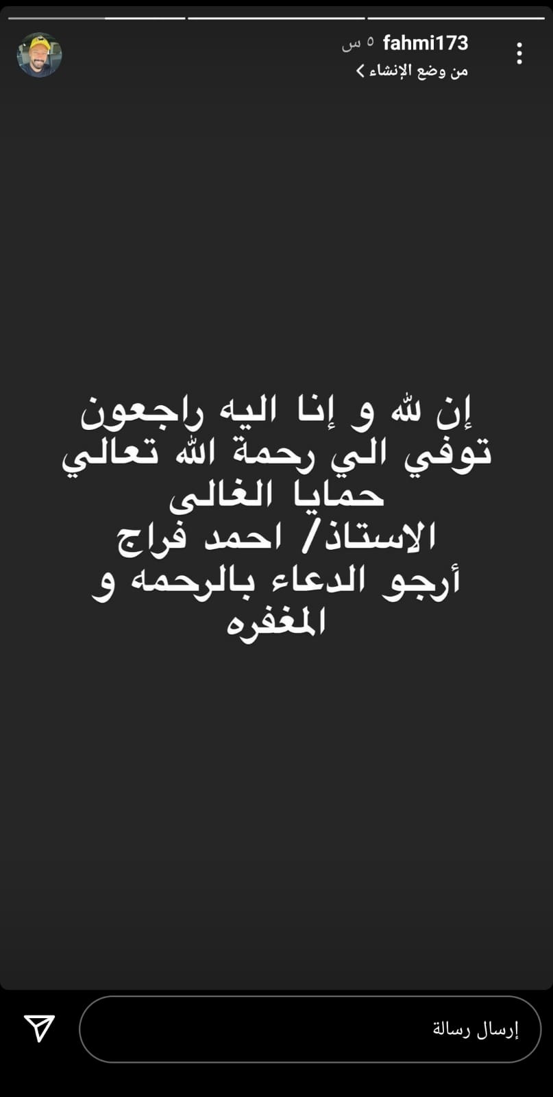 وكتب أحمد فهمي عبر خاصية ستوري، بموقع تبادل الصور والفيديوهات القصيرة انستجرام، جاء فيها: “إنا لله وإنا إليه راجعون.. توفى إلى رحمة الله حمايا الغالي، الأستاذ أحمد فراج، أرجو الدعاء له بالرحمة والمغفرة”.