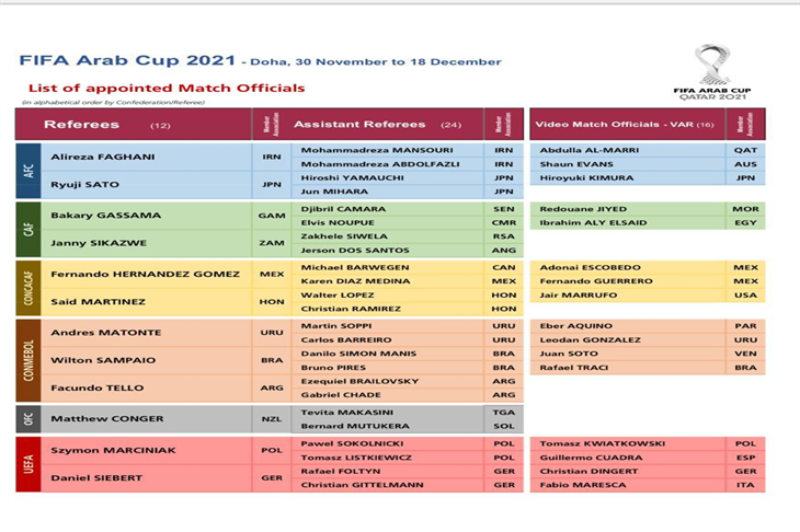 أعلن الإتحاد الدولي لكرة القدم فيفا عن قائمة الحكام المختارين لإدارة مباريات بطولة كأس العرب في نسختها الأولي.