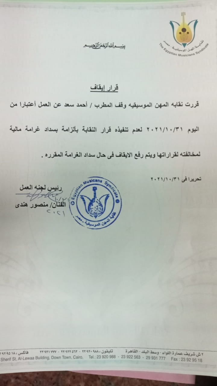 وجاء بيان النقابة بشأن أحمد سعد على النحو الأتي: “قررت نقابة المهن الموسيقية وقف المطرب أحمد سعد عن العمل اعتبارًا من اليوم 31/10/2021 لعد م تنفيذه قرار النقابة بإلزامه سداد غرامة مالية لمخالفته لقراراتها ويتم الإيقاف في حال سداد الغرامة المقررة”.