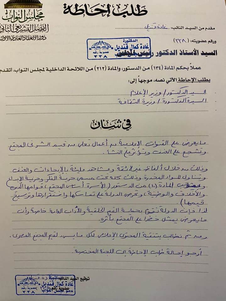كما تقدمت الدكتورة غادة قنديل عضو مجلس النواب بالمنوفية، بطلب إحاطة إلى المستشار الدكتور حنفي جبالي، رئيس المجلس ، موجه إلى وزيرة الثقافة ووزير الدلوة للاعلام ، عقب واقعة الإسماعيلية، مطالبة باتخاذ الإجراءات اللازمة لمنع ظهور مشاهد العنف والمخدرات والإيحاءات التي تطل على شاشة التليفزيون، وتدخل كل بيت مصري، وتؤذي الأجيال من الأطفال، تحت مسمى حرية الفكر والإبداع.