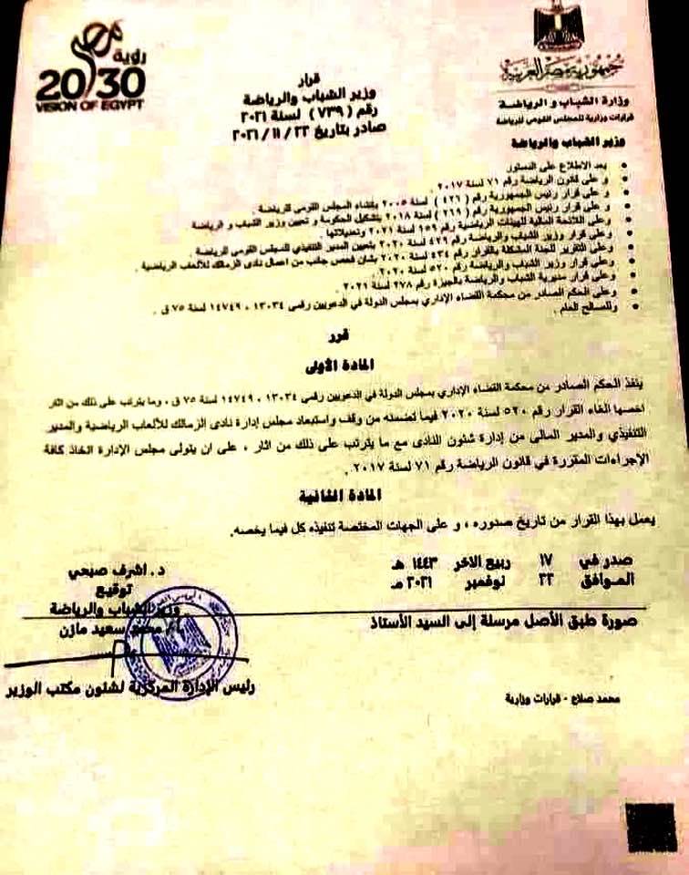 أصدرت وزارت الشباب والرياضة برئاسة أشرف صبحي، قرار بعودة المجلس السابق لإدارة الزمالك، برئاسة مرتضى منصور، لعملة بالقلعة البيضاء.