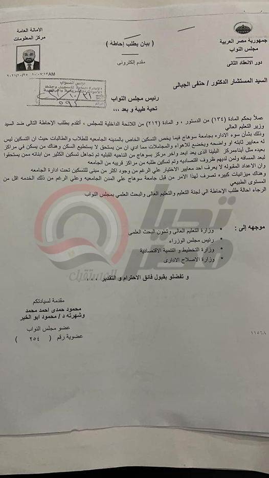 تعليم النواب تناقش مشاكل تسكين الطلاب بالمدينة الجامعية بسوهاج